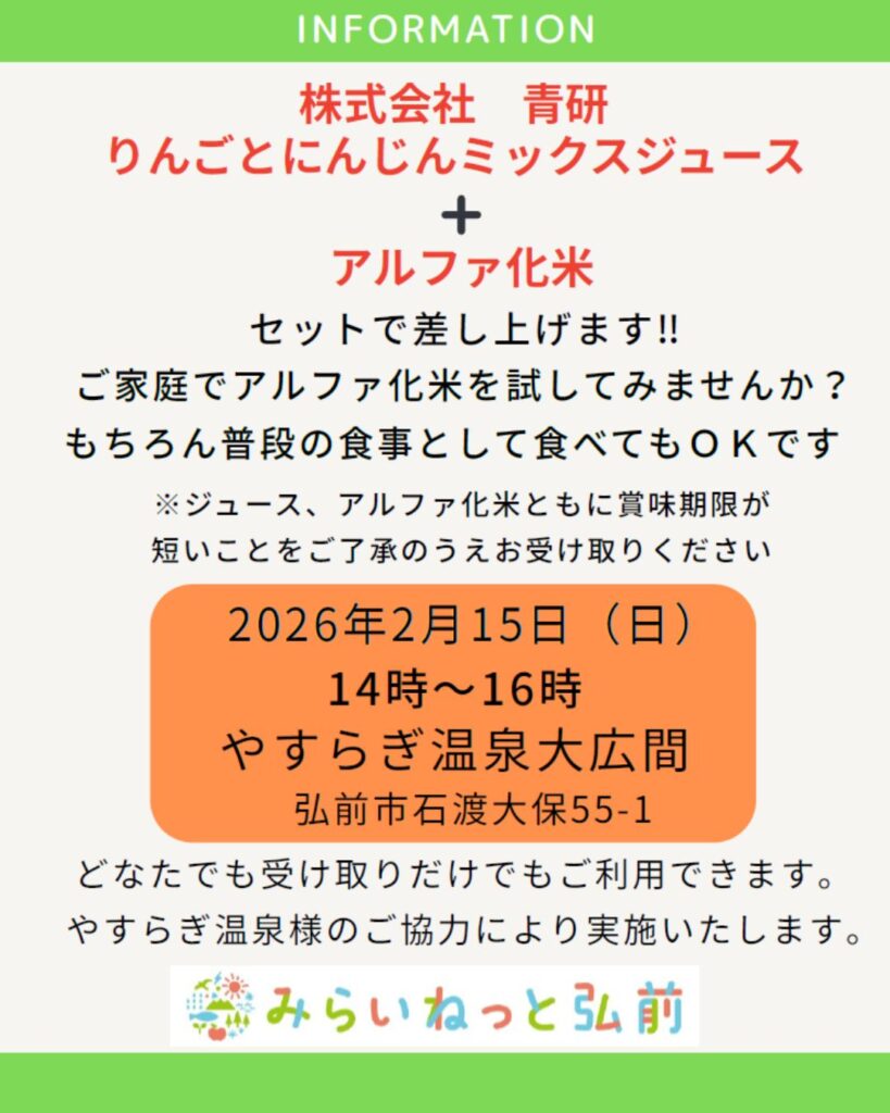 みらいねっと弘前様にて、防災食などを無料配布するイベントを開催いただきます。
